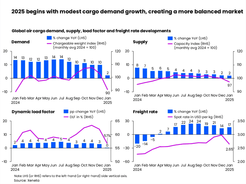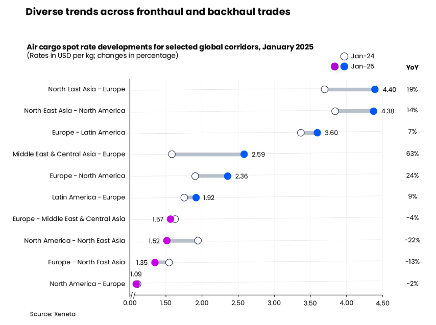 Despite January’s modest cargo growth, global spot rates remained 17% higher year-on-year, driven by factors like the e-commerce boom, limited aircraft supply, and geopolitical disruptions. Rates varied across regions, with the highest gains seen in Middle East-Europe trade lanes due to Red Sea disruptions. However, trade imbalances led to declines in backhaul corridors. Van de Wouw advises patience, noting that while e-commerce and tariff uncertainties loom, drastic shifts in air cargo demand remain speculative at this stage.